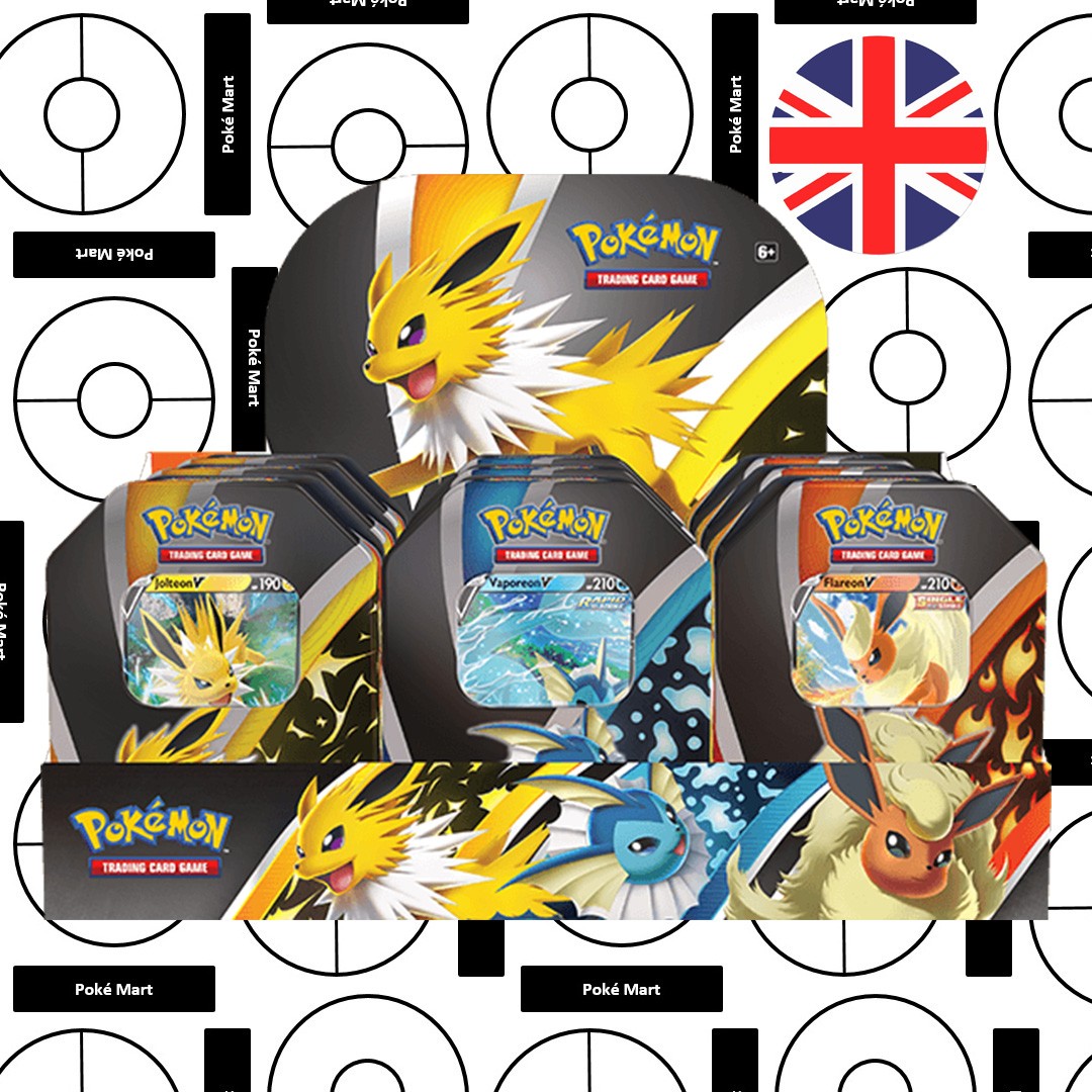 Choose the fast-pulling power of Water-type Vaporeon V, the exhilarating energy of Lightning-type Jolteon V, or the focused flames of Fire-type Flareon V in the Eevee Evolutions V Tin! Each of these colourful tins contains a handful of Pokémon TCG treasures, along with a Pokémon ready to prove itself in battle! These stunning Pokémons are all an evolution of Eevee, so Eevee can evolve into multiple variants depending on the situation. There are even more Eevee evolutions such as Sylveon, Leafeon, Espeon, Glaceon and Umbreon. These are very popular and sought-after Pokémons among collectors.