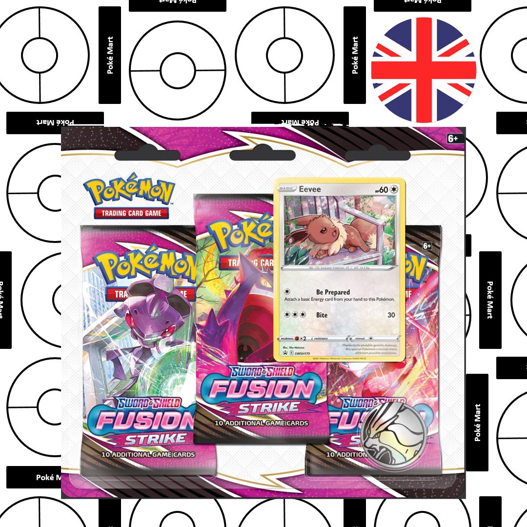 Pokémon Fusion Strike Eevee 3 Booster-blister: The road ahead has limitless potential with the new Pokémon Fusion Strike! Customisable new Pokémon V like Genesect V, Hoopa V and Mew VMAX are eager to battle, while Single Strike and Rapid Strike Pokémon loom like Rillaboom VMAX, Cinderace VMAX and Inteleon VMAX in their Gigantamax forms. Go with the flow and discover powerful new strategies in Pokémon TCG: Sword & Shield-Fusion Strike!
