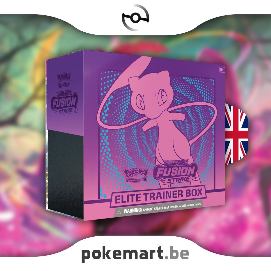 Pokémon Fusion Strike Elite Trainer Box Mew: The road ahead has limitless potential with the new Pokémon Fusion Strike! Customisable new Pokémon V like Genesect V, Hoopa V and Mew VMAX are eager to battle, while Single Strike and Rapid Strike Pokémon loom like Rillaboom VMAX, Cinderace VMAX and Inteleon VMAX in their Gigantamax forms. Go with the flow and discover powerful new strategies in Pokémon TCG: Sword & Shield-Fusion Strike!